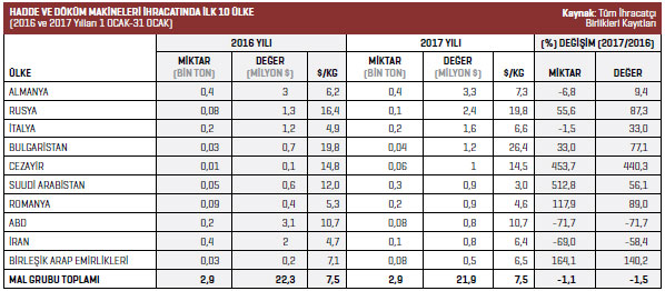 Hadde ve döküm makineleri sektöründe 2017 yılının 1-31 Ocak döneminde 21,9 milyon dolar değerinde ihracat gerçekleştirildi.