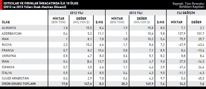 Isıtıcılar ve fırınlar ihracatı 2013 yılının Ocak-Haziran döneminde bir önceki yılın aynı dönemine göre yüzde 1,6 artış gösterdi. 2012 yılının Ocak-haziran döneminde 147,6 milyon dolarlık ihracat gerçekleştiren sektörün, 2013 yılının aynı dönemindeki ihracatı 149,9 milyon dolar olarak kaydedildi. Isıtıcılar ve fırınlar ürün grubunda 2013 yılının Ocak-Haziran döneminde 15,8 milyon dolarla en fazla ihracat Almanya’ya gerçekleştirildi. Yüzde 2,1 artışın yaşandığı söz konusu ülkeye 2012 yılının aynı döneminde gönderilen ürünlerin değeri 15,5 dolardı. Listenin ikinci sırasında ise yüzde 101,7 ihracat artışıyla Azerbaycan bulunuyor. Azerbaycan’a 2012 yılının Ocak-Haziran döneminde 5,2 milyon dolarlık ısıtıcı ve fırın ihraç edilirken bu rakam, 2013 yılının aynı döneminden 10,6 milyon dolar rakamına yükseldi. Üçüncü sıradaki Irak’a 2013 yılının Ocak-haziran döneminde ihraç edilen ürünlerin değeri 10,2 milyon dolar olarak kaydedildi. Yüzde 25,7 ihracat artışının yaşandığı söz konusu ülkeye, 2012 yılının aynı döneminde gönderilen ürünlerin değeri 8,1 milyon dolar seviyesindeydi. Listenin dördüncü ve beşinci sırasıyla ise sırasıyla Rusya ve Fransa bulunuyor. Dördüncü sıradaki Rusya’ya 2013 yılının Ocak-Haziran döneminde ısıtıcılar ve fırınlar ürün grubunda ihraç edilen ürünlerin değeri 8,6 milyon dolar oldu. Beşinci sıradaki Fransa’ya ise 2013 yılının aynı dönemindegönderilen ürünlerin değeri 7,1 milyon dolar olarak kaydedildi.Isıtıcılar ve fırınlar mal grubunda en fazla ihracat artışı yüzde 101,7 ile Azerbaycan’da yaşandı. Azerbaycan’ın ardından yüzde 45,3 ile Suudi Arabistan gelirken yüzde 25,7 ile Irak üçüncü sırada yer aldı.