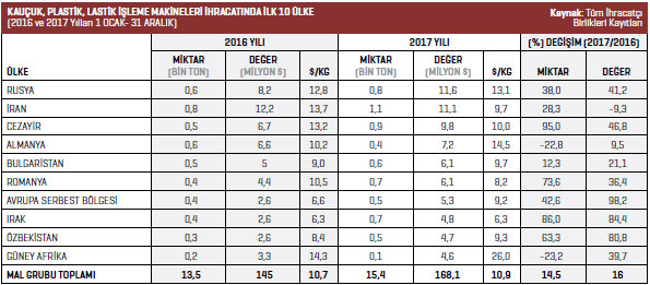 Kauçuk, plastik, lastik işleme makineleri ihracatı 2016 yılında 145 milyon dolarken 2017 yılında bu rakam yüzde 16 artışla 168,1 milyon dolar oldu.