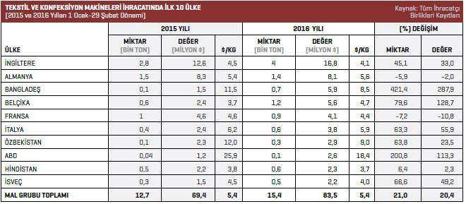 Tekstil ve konfeksiyon makineleri sektöründe 2016 yılının Ocak-Şubat döneminde en fazla ihracat gerçekleştirilen ülke 16,8 milyon dolarla İngiltere oldu. Yüzde 33 artışın yaşandığı söz konusu ülkeye, 2015 yılının aynı döneminde 12,6 milyon dolar değerinde ürün ihraç edilmişti. Listenin ikinci sırasında bulunan Almanya’ya 2016 yılının Ocak-Şubat döneminde 8,1 milyon dolarlık ihracat gerçekleştirildi. Listenin üçüncü sırasında yer alan Bangladeş’e yönelik tekstil ve konfeksiyon makineleri ihracatı 2016 yılının OcakŞubat döneminde, geçen yılın aynı dönemine göre yüzde 287,9 artış gösterdi. 2015 yılının Ocak-Şubat döneminde 1,5 milyon dolarlık ürün gönderilen Bangladeş’e, 2016 yılının aynı döneminde ihraç edilen ürünlerin değeri 5,9 milyon dolara yükseldi. Dördüncü sıradaki Belçika’ya 2015 yılının OcakŞubat döneminde 2,4 milyon dolarlık tekstil ve konfeksiyon makinesi ihraç edilirken 2016 yılının aynı döneminde bu rakam yüzde 128,7 artışla 5,6 milyon dolar oldu. Listenin beşinci sırasında yer alan Fransa’ya 2016 yılının OcakŞubat döneminde 4,1 milyon dolar değerinde ihracat gerçekleştirildi.