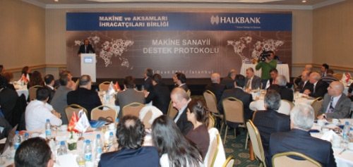 Protokol imza töreninde Makine ve Aksamları İhracatçıları Birliği Yönetim Kurulu Başkanı Adnan Dalgakıran, Halkbank Genel Müdürü Hüseyin Aydın ve Makine ve Aksamları İhracatçıları Birliği Yönetim Kurulu Başkan Yardımcısı M. Serol Acarkan konuşma yaptı. Destek paketi kapsamında, Birlik üyesi makine ihracatçılarının üretim süreçlerindeki verimliliklerini arttırmaya ve yeni yatırımlarında finansman ihtiyaçlarına yönelik, ödemesiz dönem dahil olmak üzere 10 yıla varan vadelerle kredi kullandırılacağı açıklandı.