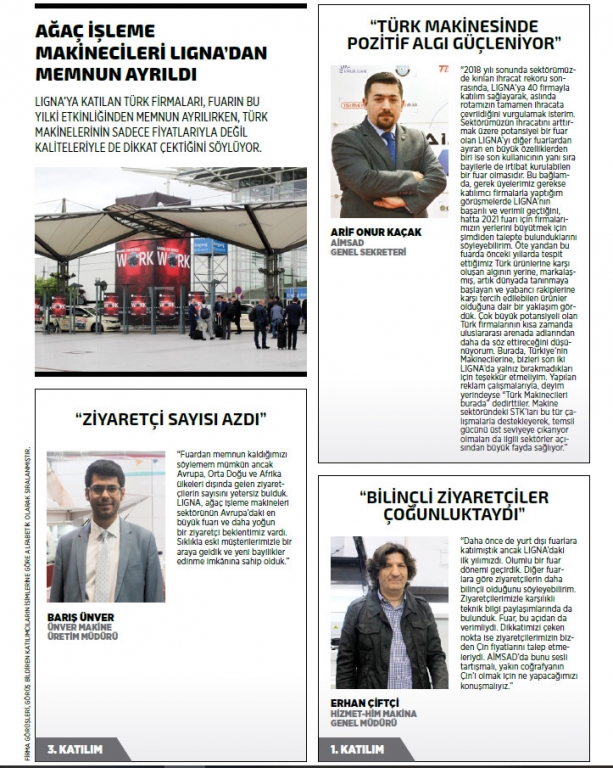 Makine sanayisinin tüm alt sektörlerinde, o sektör için önemli olan ihtisas fuarlarına katılmaya özen gösteren Türkiye’nin Makinecileri, Ağaç İşleme Makine ve Yan Sanayisi İş Adamları Derneğinin (AİMSAD) önerisiyle LIGNA’ya ikinci kez katılırken, ziyaretçilere Türk ağaç işleme makineleri sektörü ve üyeleri hakkında bilgi verdi. Türkiye’nin Makinecilerinin fuar alanı ve çevresindeki reklam çalışmaları ise her zaman olduğu gibi yine hem katılımcı Türk firmaları hem de fuar ziyaretçilerinin yoğun ilgisini çekti.