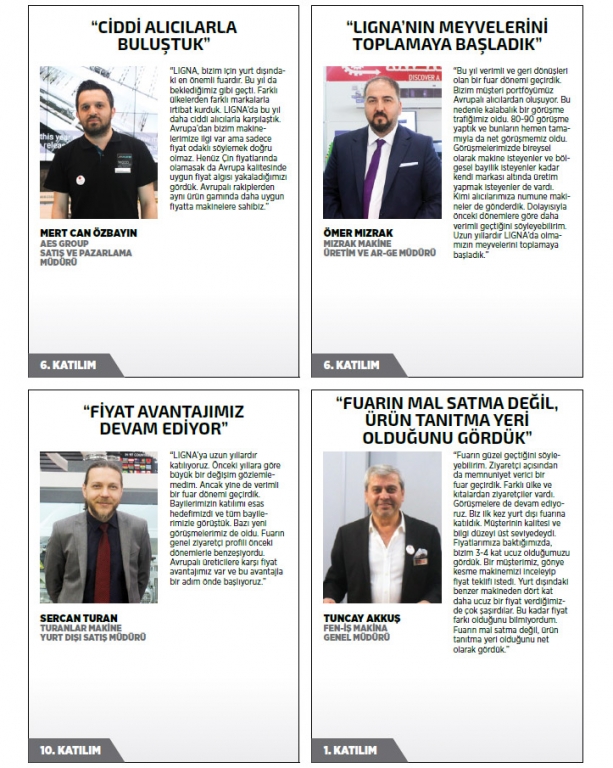 AĞAÇ İŞLEME MAKİNELERİ ALANINDA DÜNYANIN ÖNEMLİ FUARLARINDAN OLAN LIGNA, 27-31 MAYIS TARİHLERİNDE ALMANYA’NIN HANNOVER KENTİNDE DÜZENLENDİ. FUARA KATILAN 40 TÜRK FİRMASI FUARDAN MEMNUN AYRILIRKEN, TÜRK MAKİNELERİ KALİTELERİYLE ZİYARETÇİLERİN İLGİ ODAĞI OLDU.