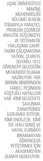 Bölümlerinin kendilerine sunduğu imkanlar sayesinde teorik bilginin yanı sıra uygulamada da ciddi anlamda yol aldıklarını belirten Uşak Üniversitesi Makine Mühendisliği Bölümü öğrencileri, bölümlerinin öğretim üyesi kadrosu açısından da değerlendirildiğinde alanında son derece yetkin, etkili çalışma potansiyeline sahip uzman akademisyenlerden oluştuğunu vurguluyor. 2006 yılında kurulmuş üniversiteler arasında en hızlı gelişen, inovasyona açık olan ve Uşak gibi huzurlu, sakin bir şehirde yer almasının bu üniversiteyi tercih etmelerinde etkili olduğunu söyleyen bölüm öğrencileri, gelinen noktada bölümün her alanda bilgi edinebilme, yeni projelere dair fikir edinebilme konusunda beklentilerini karşıladığını ifade ediyor.