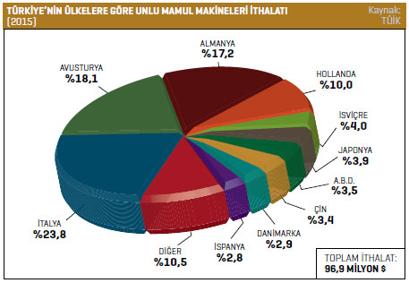 2015 yılında unlu mamul makineleri ithal ettiği ilk 10 ülkenin yedisinde ithalat rakamlarını geriye çeken sektörün en fazla ithalat gerçekleştirdiği pazar İtalya olarak karşımıza çıkıyor. Türkiye, İtalya’dan 2014 yılında 55 milyon dolarlık unlu mamul makineleri ithal ederken, 2015 yılına gelindiğinde bu rakamı yüzde 58,3’lük düşüşle 23 milyon dolara kadar çekti.