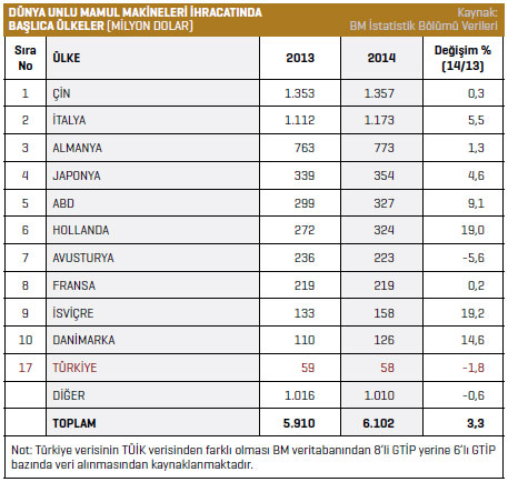 2014 yılında dünyada gerçekleşen 6 milyar 102 milyon dolarlık unlu mamul makineleri ihracat pastasından 1 milyar 357 milyon dolarla yüzde 22 pay alan Çin, söz konusu rakamla listenin en başında yer aldı. 2014 yılında dünya unlu mamul makineleri ihracatından ilk on ülke arasında en az paya sahip ülke ise 126 milyon dolarla Danimarka oldu. 2014 yılında bir önceki yıla göre unlu mamul makineleri ihracat oranını en fazla artıran ülke İsviçre olurken, onu yüzde 19 ile Hollanda takip etti. İhracatta en fazla düşüşün söz konusu olduğu ülke ise Avusturya’ydı. 2013 yılında dünyanın değişik noktalarına 236 milyon dolarlık unlu mamul makineleri ihraç eden Avusturya, 2014 yılında yüzde 5,6’lık düşüşle 223 milyon dolar değerinde ihracat gerçekleştirdi.