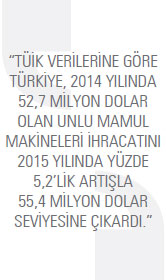 TÜİK verilerine göre dünyanın değişik noktalarına unlu mamul yapımında kullanılan makineler ihraç eden Türkiye’nin 2014 yılında 52,7 milyon dolar olan ihracatı, 2015 yılında 55,4 milyon dolar seviyesinde gerçekleşti. Söz konusu artışla sektör, 2015 yılında ihracat rakamlarında yüzde 5,2’lik bir yükseliş yaşamış oldu.