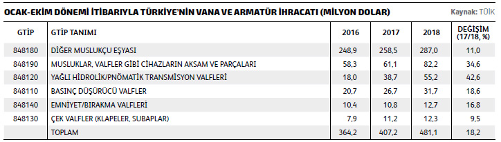 Yine TÜİK’in açıkladığı verilere göre, bu yılın Ocak-Ekim döneminde Türk vana ve armatür imalatçıları, en çok 848180 GTİP numaralı “Diğer muslukçu eşyası” ürün grubunda ihracat gerçekleştirmiş durumda. Bu ürün grubunda, geçtiğimiz yılın aynı dönemine göre yüzde 11’lik bir değer artışı yaşanırken, sektör ihracatı da 287 milyon dolar oldu. Listenin ikinci sırasında yer alan 848190 GTİP numaralı “Musluklar, valfler gibi cihazların aksam ve parçaları” ürün grubunda yüzde 34,6’lık bir artış görülürken, sektör ihracatı 82,2 milyon dolar oldu. Üçüncü sıradaki 848120 GTİP numaralı “Yağlı hidrolik/pnömatik transmisyon valfleri” ürün grubunda ise geçtiğimiz yılın aynı dönemine göre yüzde 42,6’lık artış yaşandı ve 55,2 milyon dolarlık ihracat değerine ulaşıldı.