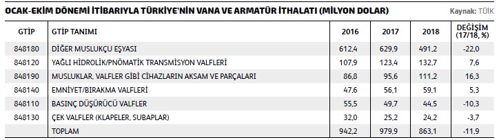 Bununla birlikte, TÜİK’in açıkladığı verilere göre, bu yılın Ocak-Ekim döneminde Türkiye’nin sektör ithalatı da yüzde 12’ye ulaşan değerde daralma yaşıyor. Ancak Türkiye’nin en çok ithalat yaptığı ilk 10 ülke listesinin ilk üç sırasındaki toplam ithalat tutarının neredeyse Türkiye’nin sektör ihracat toplamına eş değerde olması, Türkiye’deki ithal bağımlılığını bir kez daha ortaya koyuyor. Bu kapsamda, Türkiye’nin en çok ithalat yaptığı ilk 10 ülke listesinin ilk sırasında yer alan İtalya’dan yüzde 27 düşüşle 160 milyon dolarlık ithalat yapılırken, ikinci sıradaki Çin’den yüzde 22 düşüşle 154,3 milyon dolar ve üçüncü sıradaki Almanya’dan da yüzde 4,5 düşüşle 151 milyon dolarlık ithalat yapıldığını söyleyebiliriz. Bu dönemde Türkiye’nin gerçekleştirdiği vana ve armatür ithalat toplamı ise TÜİK verilerine göre 863,1 milyon dolar olarak ölçülüyor.