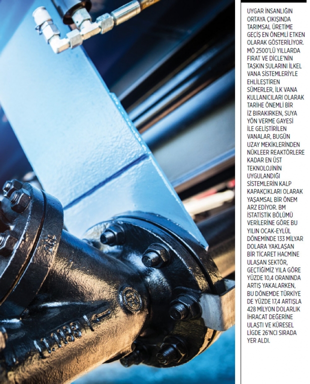 Vanalar (valfler) ve armatürler, makine ailesinin çok önemi üyeleridir; borularla aktarılmakta olan sıvı veya gazların akışını durdurmaya ya da serbest bırakmaya yarayan aygıtlar olarak tanımlayabileceğimiz vana ve armatürler, bu yetkinliklerinin ötesinde akışkanlara yol veren, onları durduran, karıştıran veya akışkanın yönünü ve/veya miktarını, basınç veya sıcaklığını değiştirebilen cihazlardır. Modern yaşamın nizami bir biçimde işlemesini sağlayan, yer altı ve yer üstünde yüzlerce çeşidi ile 7/24 çalışan vana ve armatürler; dünya ve Türkiye ticaretinde de gizli bir kahraman gibidir. Bu yılın Ocak-Ekim döneminde 1 milyar 344 milyon dolarlık bir ticaret hacmi oluşturan vana ve armatür sektöründe yüzde 18,2 ihracat artışı gerçekleşirken, ithalat ise yüzde 12 oranında daraldı. Ancak sektör ithalatındaki daralmaya rağmen vanalar ve armatürler ihracatının ithalatı karşılama oranı halen yüzde 55,7 seviyesinde ilerliyor. Günümüzde vanalar, akış kontrolü anlamında akış hızını, hacmini, basıncı ve akış yönünü kontrol ederken, büyüklükleri de kullanım amacına göre değişebiliyor. Vana çapı 10 metreye kadar çıkabilirken, üretim metotları ve teknoloji açısından çeşitleriyse yerel marketlerde kolaylıkla bulunabilen basit pirinç vanadan, nükleer reaktörlerde kullanılan ve hassas alaşımlardan üretilen çok karmaşık soğutma sistemi vanalarına kadar değişkenlik gösterebiliyor.