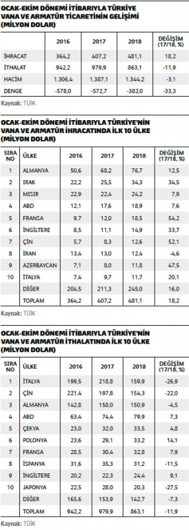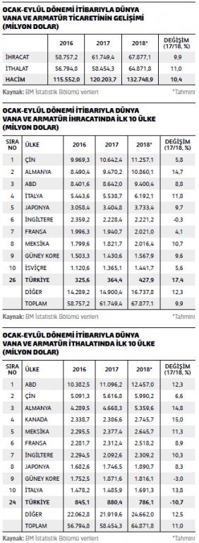 Sektörün küresel ihracatında ilk 10 ülke içerisinde yer alan diğer ülkeler ise İtalya, Japonya, İngiltere, Fransa, Meksika, Güney Kore ve İsviçre olarak sıralanırken, ilk 10 ülke listesinde İngiltere hariç tüm ülkelerin 2017’nin aynı dönemine göre ihracatlarını yüzde 4 ila yüzde 15 aralığında yükseltmiş olması ise dikkat çekici bir veri olarak öne çıkıyor. Benzer şekilde, Türkiye de 2017’nin aynı dönemine göre sektör ihracatını yüzde 17,4 yükseltirken, Türk vana ve armatür sektörünün 2018 yılı Ocak- Eylül dönemindeki ihracatı ise BM İstatistik Bölümü verilerine göre 428 milyon dolar olarak ölçülüyor. Bu rakamla Türkiye, halen dünya sıralamasında 26’ncı sırada yer alıyor.