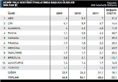 2011 yılında en fazlaithalat artışı gösteren ülke yüzde 68,7ile Rusya oldu. Rusya böylelikle 2011yılında 4,2 milyar dolar değerinde ürünithal ederek listenin dördüncü sırasında yer aldı. Azalış yaşayan Brezilya ise 2011 yılında bir önceki seneye göre yüzde 12,1 değerinde ithalatını azalttı.Türkiye demir yolu sektörü ithalatı listesinde 13’üncü sırada yer alıyor. 2009 yılında 1,1 milyar dolar değerinde ithalat gerçekleştiren ülkemiz 2010 yılında azalış göstererek 1 milyar dolar seviyesine indi. Ancak 2011 yılında demir yolusektörü ithalatında yüzde 33,9 artış yaşayarak1,4 milyar dolar seviyesinde demiryolu makine ve aksamı ithal etti.