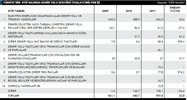 Türkiye geçtiğimiz seneye göre demiryolu sektöründe ithalatını yüzde 32,8artırdı. 2010 yılında 683,7 milyon dolar değerinde demir yolu makine ve aksamı ithal eden ülkemiz 2011 yılında907,8 milyon dolar seviyesine yükseldi.Sektör ithalatında kalemlere bakıldığızaman en fazla ithal edilen ürün grubunun “Elektrik Enerjisini DışarıdanAlan Demir Yolu ve Tramvay Vagonları”olduğu görülüyor. Söz konusu vagonlardan 2010 yılında 388,9 milyon dolardeğerinde ithal edildi.