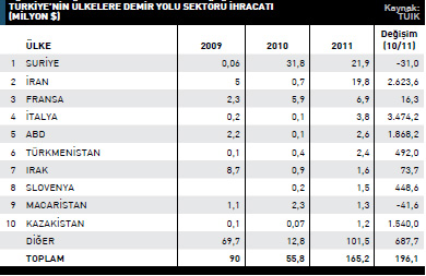 2010yılında 31,9 milyon dolar olan ihracat rakamı 2011 yılında 44,9 milyon doları aştı. Üçüncü sırada “Diğer Amaçlı Konteynerler”ürün grubu bulunuyor. 2010yılına göre yüzde 54,2 büyüyen “DiğerAmaçlı Konteynerler” mal grubundan2011 yılında 8,2 milyon dolar değerindeihraç edildi.Türkiye’nin ülkelere göre demir yolu sektörü ihracatına bakıldığında ise 2011 yılında en fazla Suriye’ye ürün gönderdiği görülüyor. Listede birincisırada bulunan Suriye’ye 2011 yılında 21,9 milyon dolar değerinde demir yolu makine ve aksamı gönderildi. İkinci sırada bulunan İran’a yönelik ihracatta ise önemli bir yükseliş dikkat çekiyor.