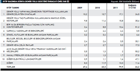 Demir yolu makine ve aksamlarınındünyadaki ihracatına bakıldığında 2010 yılına göre yüzde 26,2 artış yaşandığı görülüyor. 2010 yılında 63,3 milyar dolar düzeyinde ihracat gerçekleşti. Bu rakam 2011 yılında 79,9 milyar dolara yükseldi.Dünya demir yolu ihracatında ilk sırada“Demir Yolu Yapım MalzemesininTespitinde Kullanılan Demir/Çelikten Cıvatalar” kalemi yer alıyor.