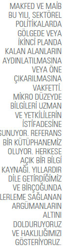 MAKFED ve MAİB bu yılı, sektörel politikalarda gölgede veya ikinci planda kalan alanların aydınlatılmasına veya öne çıkarılmasına vakfetti. Mikro düzeyde bilgileri uzman ve yetkililerin istifadesine sunuyor. Referans bir kütüphanemiz oluyor. Herkese açık bir bilgi kaynağı. Yıllardır dile getirdiğimiz ve birçoğunda ilerleme sağlanılan argümanların altını dolduruyoruz ve haklılığımızı gösteriyoruz. Katkıda bulunan bütün meslekdaşlarımıza, bunlardan yararlanan paydaşlarımıza ve bürokrasimize şükranlarımızı sunuyoruz. Bu çalışmaların yapılabilmesine bilgi ve fon sağlayan Türkiye’nin Makinecileri’ne ve MAKFED üyesi derneklere müteşekkiriz.