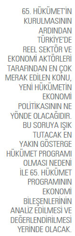 İki seçim geçiren, başta Euro bölgesi olmak üzere yakın ticaret ortaklarındaki durgunluk ve küresel finansal piyasalardaki belirsizlikten olumsuz etkilenen, diğer taraftan artan jeopolitik gerginlikler ve FED’in faiz artırımına bağlı dalgalanmalara rağmen 2015 yılında yüzde 4 büyüyen Türkiye ekonomisi, diğer gelişme yolundaki ülkelerden pozitif bir şekilde ayrışmayı başardı. 2016 yılında 65. Hükümeti’n kurulması ile Türkiye’de yeni bir dönem başladı. Yeni dönemin yalnızca siyaseten değil aynı zamanda ekonomi yönetimi açısından da farklı olacağının ilk sinyali, Ekonomi Koordinasyon Kurulu’nun (EKK) yapısında gerçekleştirilen değişimden çıkarmak mümkün görünüyor. EKK kurulduğu tarihten bu yana Başbakan Yardımcısı başkanlığında toplanıp karar alırken, 65. Hükümet döneminde Başbakan’ın başkanlığında bir araya gelecek olması oldukça önemli bir sinyal. Ekonomi yönetiminde dümende başbakanın bulunacak olması, bu dönemde Türkiye’nin geleceği açısından kararlılıkla üzerinde durulması gereken ve Hükümet programında yer verilen unsurların hayata geçirilmesinde etkili olacak.
