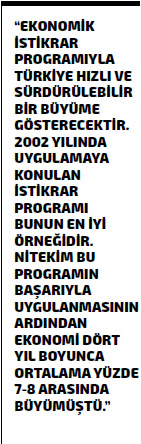 Hedefleri belli böyle bir program açıklanırsa kısa sürede sağlanacak güven ve iyileşecek beklentiler, piyasaları da olumlu etkileyecektir. Eğer ekonomide fiyat istikrarı, finansal istikrar ve sürdürülebilir büyümeyi sağlayacak bir istikrar programı uygulanmaz ve öncelik, ne olursa olsun hızlı ekonomik büyüme olarak belirlenirse, ekonomide daha büyük sıkıntılar yaşanacaktır. İstikrar programının hedefleriyle hızlı büyümeye yönelik politikaların da aynı anda uygulanması, yine yeni sıkıntılar yaratacaktır. Bu nedenle, öncelikle böyle bir programla istikrar sağlandıktan sonra Türkiye hızlı ve sürdürülebilir bir büyüme gösterecektir. 2002 yılında uygulamaya konulan istikrar programı bunun en iyi örneğidir. Nitekim bu programın başarıyla uygulanmasının ardından ekonomi dört yıl boyunca ortalama yüzde 7-8 arasında büyümüştü.