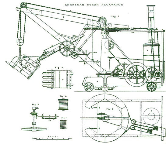 0,8 metreküp kovası olan ve bir çemberin yarısı kadar dönebilen bu makinedeki bom hareketleri halat ve zincirlerle sağlanıyordu. Makinenin üzerinde, inşa edildiği tren yolu şasisinin bir tarafında kazan ve hareket mekanizması, diğer tarafında ise bom ve onu tahrik eden sistem bulunuyordu. İcadını 1839 yılında patent altına alan Otis’in 26 yaşında genç ölümü ve sonrasında ailesinin bu patenti paylaşma konusundaki isteksizliği, bu alandaki teknolojinin gelişmesini patent süresinin dolduğu 1870’lere kadar geciktirdi.