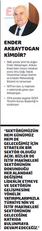 SEKTÖRÜMÜZDE MEVCUT OLARAK ÜRETİM YAPAN FİRMALARIMIZIN İŞ GÜCÜ VE TEKNOLOJİ ANLAMINDA HİÇBİR EKSİĞİ OLDUĞUNU DÜŞÜNMÜYORUM. SADECE İŞ GÜCÜ VE KAPASİTE OLARAK POTANSİYELİMİZİN FARKINDA OLMADIĞIMIZA İNANIYORUM” DİYEN İSDER YÖNETİM KURULU BAŞKANI ENDER AKBAYTOGAN, KATMA DEĞERİ YÜKSEK MAKİNE AKSAM VE PARÇALARINI ÜRETİRKEN, İMALATTA DIŞA BAĞIMLILIĞIN AZALTILMASI VE SEKTÖREL ÜRETİMİN KALİTESİNİN YÜKSELTİLMESİNİN ÖNEMİNE DİKKAT ÇEKİYOR.