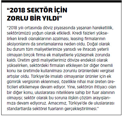 Forklift ve istifleme makineleri ürün gruplarına bakıldığı zaman 2016’da 14 bin 52 olan satış rakamımızın 2017’de 15 bin 102’ye çıkmasına rağmen bu yıl Ocak-Kasım ayları döneminde 10 bin seviyesine gerilediğini söyleyebiliriz. Bu gelişme, bir önceki yıla göre yüzde 33’lük bir gerilemeye de işaret ediyor. Aslında 2018’e 2017’den daha iyi bir başlangıç yapmıştık ancak yıl ortasında yaşanan kur hareketliliği ay bazında daralmaları da beraberinde getirdi. Örneğin, 2017’de yüzde 70 artış yaşadığımız platform grubunda, bu yıl yüzde 70’lere yaklaşan kayıplar yaşadık. Bu yıl, ihracat yapabilen firmalarımızın ticaretlerine devam edebildikleri, sadece iç pazara yönelik satış yapan firmaların ise ihracata yönelme çabalarıyla geçen bir yıl oldu. Üretim olarak bazı ana ürünlerde dışa bağımlılığımız devam ediyor. Diğer yandan, üretimde kullanılan parça ve komponentlerde yapılan ithalatın dövize endeksli olmasından dolayı üretim maliyetlerinde de artışlar yaşanıyor.