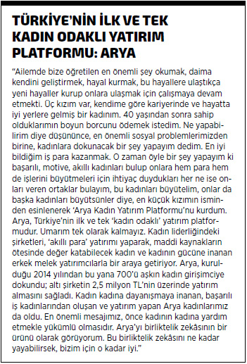 İş dünyasında en iyi yatırım, her zaman insanların bakmayı unuttuğu yerlerden çıkıyor. Kadınların göz ardı edilmiş bir fırsat olduğuna inanıyorum. Özellikle üçüncü kızım Arya doğduktan sonra, geleceğin Türkiye’sinde kadının daha karar verici, sermaye sahibi, güçlü pozisyonlarda olması için ne yapabilirim diye çok düşündüm. Nihayetinde kadın liderliğindeki şirketlerle kadın melek yatırımcıları, kız babalarını ve kadının gücüne inanan erkekleri bir araya getiren Arya Kadın Yatırım Platformu’nu kurdum.