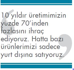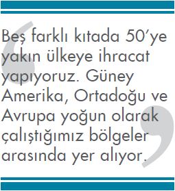 İhracata yönelik bir firmayız. Son 10  yıldır üretimimizin yüzde 70’inden fazlasını ihraç ediyoruz. Ürün gamımızda yer alan tüm kalemlerde ihracat gerçekleştiriyoruz. Hatta bazı ürünlerimizi sadece yurt dışına satıyoruz. Çünkü yurt içinde bu ürünleri kullanmak için gerekli verimlilik düzeyi henüz oluşmadı.Beş farklı kıtada 50’ye yakın ülkeye ihracat yapıyoruz. Yoğun olarak  çalıştığımız bölgeler; Güney Amerika, Ortadoğu ve Avrupa. Ayrıca Güney Asya’ya olan ihracatımız da artış gösteriyor. Son yıllarda ihracat mevzuatında yapılan olumlu değişiklikler ve firmamızın lojistik gücü sayesinde herhangi bir sorunla karşılaşmıyoruz.