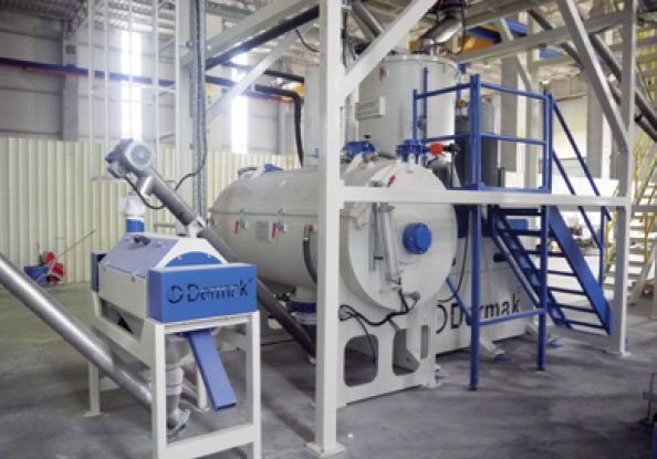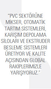 Dermak Makine olarak PVC sektörüne yönelik mikser, otomatik tartım sistemleri, karışım depolama siloları ve ekstruder besleme sistemleri üretiyor ve ürün kalitemizle Avrupalı rakiplerle yarışıyoruz. Makinelerimiz PVC bazlı üretimlerde işin mutfağını oluşturuyor. Nihai ürünün imalatından önce gerekli olan formüller bizim makinelerimizde hazırlanır. Diğer bir deyişle PVC bazlı ürün imalatına yönelik ilk adımı biz atıyoruz. Ürünlerimizi ana hatlarıyla dokuz başlık altında sıralayabiliriz. DMIX serisi PVC Isıtıcı-Soğutucu Mikserlerimiz, V serisi (Dikey tip soğutucu) ve H serisi (Yatay tip soğutucu) olarak ikiye ayrılıyor. PVC mamuller ilk olarak mikserleme aşamasından geçer. Kaliteli ürün almak için son derece homojen bir formülasyon elde etmek gerekir. Firmamız uzun yılların getirdiği tecrübeyle PVC mikserleme konusunda lider konumdadır. Gravimetrik otomatik toz dozajlama sistemlerimiz de toz ve sıvı dozajlama olarak ikiye ayrılıyor. Geliştirdiğimiz gravimetrik otomatik dozajlama sistemiyle (DDSys) tüm PVC üretimlerinin en önemli gereksinimi olan kaliteli formülasyonları el değmeden otomatik olarak hazırlayabiliyoruz. Sistem, gerek plastifiye edilmemiş (PVC-U) gerekse plastifiye edilmiş (PVC-P) formülasyonlarını en mükemmel şekilde hazırlayarak mikserlenip ekstruzyona hazır hale getirir. Yumuşak PVC formülasyonlarında DLSys (Gravimetrik Sıvı Dozajlama) ile akuple çalışarak gerekli olan formülasyonu kullanıma hazır hale getirir. DMIX MB Serisi Metalik Bonding Mikserlerimizse metalik toz boya üretiminde kullanılan metalik kaplama mikserleridir. DMIX WPC Serisi Ahşap Polimer Kompozit Mikserlerimiz, ahşap ve plastiğin karışımıyla elde edilen WPC (Wood Polymer Composite) ürünlerle çevreci ve ekonomik çözümler sunuyor.