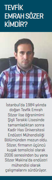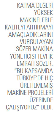 mutfağında olan kişilerin fikirlerini alıyor, nihai kararlarımızı bu bilgiler doğrultusunda olgunlaştırıyoruz. Motivasyonu ve katma değeri etkileyen diğer bir etmen de maddi destektir. Çalışanlarımıza ihtiyaç duydukları anda uygun geri ödeme koşullarıyla bu desteği imkanlarımız dahilinde sağlıyoruz. Sosyal anlamda da gelişim ve iletişimlerini pekiştirmek için çeşitli organizasyonlar düzenlemeye çalışıyoruz. Ulusal ya da uluslararası fuarlara katılıyor musunuz? Fuarların firmanız için öneminden bahseder misiniz? Yurt içinde düzenlenen ve hizmet verdiğimiz sektörlerle alakalı tüm fuarlara katılıyoruz. Bu noktadaki amacımız yeni firmalara ulaşabilmek, mevcut müşterilerimize yeni makinelerimizi sunmak, onların geri dönüşlerini dinlemek ve çözümler geliştirebilmektir. İlk ihracatını 1986 yılında gerçekleştiren bir firma olarak bu noktaya ulaşabilmemizdeki en önemli etmen yurt dışında katıldığımız fuarlardır. Çünkü bilinirliğinizin arttığı ölçüde satışlarınız da artıyor. Ayrıca tüm fuarlara makinelerimizle katılmaya özen gösteriyoruz. Standımızı ziyaret eden misafirlerimiz ürünlerimizi katalogdan değil de birebir karşılarında gördüğünde bakış açıları değişiyor. Özellikle Avrupa kıtasında katıldığımız fuarlar neticesinde insanların “Bu firmayı daha önce Almanya’da, Fransa’da da gördüm!” şeklinde görüş bildirmesi, firma isminin insanların aklında yer etmesine ve Türkiye’de de bu kalitede ürünlerin yapıldığı bilincinin oluşmasını sağlıyor. “İHRACATTAKİ BAŞARIMIZ KALİTEMİZİN GÖSTERGESİDİR” İmal ettikleri makinelerin yurt dışında hizmet verebilecek kalite ve nitelikte olduğunu belirten Sözer, “1986 yılından bu yana ihracat yapan bir firma olarak bugün itibariyle yıllı