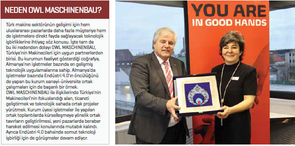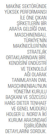 Holger U. Nord: Alman makine ve tesis mühendisliği sektörü Dördüncü Sanayi Devrimi’nin eşiğinde. Tüm üretim ve üretim süreçleri dijitalleştiriliyor ve süreçler arasında network sağlanıyor. Böylece, dinamik ve örgütlü bir şekilde değer yaratan ağlar oluşturmak temel hedefimiz. Ayrıca tüm bu süreç yalnızca herhangi bir üretim alanının dijitalleştirilmesi ya da bağlanması anlamına gelmiyor, aynı zamanda şirketlerin ötesine geçerek onların farklı değerler yaratan adımlarını ulusal sınırların dışına taşıyarak bütünleştiriyor. Bu ve buna benzer yapıların yaratılması, OWL MASCHINENBAU işbirliğindeki şirketlerin çoğunluğunu oluşturan KOBİ’ler için son derece zorlu ve geliştirici bir görev. Bu durumda şirketler arası işbirliği ve bilgi transferi de başarının anahtarıdır. Başarı için ayrıca, inovasyon, sürdürülebilirlik, gelecek hedefleri ve günlük iş faaliyetleri arasındaki uyum da artırılmalıdır.