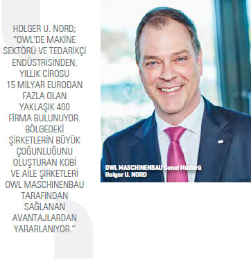 Holger U. Nord: Şu anda Ostwestfalen- Lippe’de makine sektörü ve tedarikçi endüstrisinden, yıllık cirosu 15 milyar eurodan fazla olan yaklaşık 400 firma var. Bu sayede OWL, Avrupa’nın önde gelen bölgesel makine kümeleri arasında yerini alırken, ülke içinde ise Alman makine mühendisliği sektörünün çok yönlü çeşitliliğini ve yenilikçi kapasitesini temsil ediyor. Yapısal olarak bakıldığında ise OWL’deki şirketlerin büyük çoğunluğunu KOBİ’ler ve aile şirketleri oluşturuyor. Bu işletmeler de OWL MASCHINENBAU