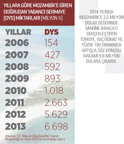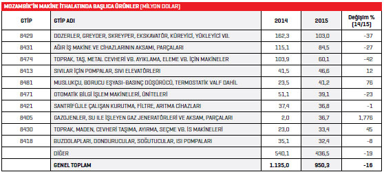 2014 yılında Türkiye’den 4 milyon dolar seviyesinde makine ithal eden Mozambik, 2015 yılında söz konusu rakamda yüzde 125,3 oranında artış yaşadı. Türkiye, 8,9 milyon dolarla Mozambik’in 2015 yılında en fazla makine ithal ettiği ülkeler listesinin 15. sırasında yer aldı.