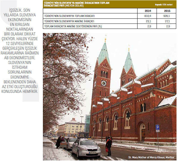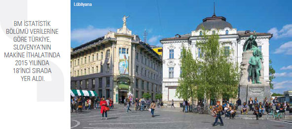 Bölümü verilerine göre, 2015 yılında yüzde 14,7 kayıpla 2,9 milyar dolar seviyesinde gerçekleşti. Bu dönemde, Almanya, Avusturya ve Hırvatistan Slovenya’nın en güçlü ticaret ortakları olurken, İtalya, Rusya, Fransa, Sırbistan, Romanya, ABD ve Polonya, Slovenya’nın makine ihracatında önemli ülkeler olmayı sürdürdü. Bu dönemde Türkiye de 28,1 milyon dolarlık alımla Slovenya’nın makine ihracatında 21’inci sırada yer aldı.