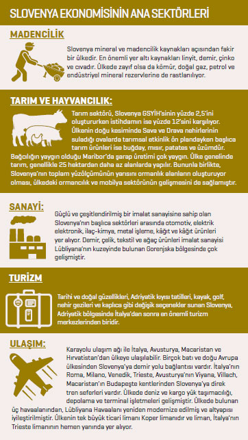 Dünya Bankası’nın hazırladığı ve 189 ülkedeki yatırım ortamının elverişliliğini ölçen “Doing Business 2016” raporunda 29’uncu sırada yer alan Slovenya, 2009 yılında küresel krizden büyük ölçüde etkilenmiş ve ülke ekonomisi yüzde 8 oranında küçülmüştü. AB ile geniş çaplı bir bankacılık krizinin eşiğine gelen ülke finansal yapılanma hamleleriyle toparlanma eğilimine girmesinin ardından 2010 yılında yüzde 1,4, 2011 yılında ise yüzde 1,1 büyüdükten sonra bu çizgisini bozmadı ve yine Dünya Bankası’nın 2016 yılı tahminlerine göre geçtiğimiz yılı yüzde 2’nin üzerinde bir büyüme tablosuyla kapattı. Bununla birlikte işsizlik, son yıllarda Slovenya ekonomisinin en kırılgan noktalarından biri olarak dikkat çekiyor. Halen yüzde 12 seviyelerinde gerçekleşen işsizlik rakamlarına rağmen AB ekonomistleri, Slovenya’nın istihdam sorunlarının ekonomiye beklenenden daha az etki oluşturduğu konusunda hemfikir ve Slovenya’nın istihdam skorlarını başarılı olarak değerlendiriyor. Slovenya’nın elde ettiği gelirin dağılımında ilk sırada yüzde 67,3 ile hizmetler sektörü yer alırken, sanayi yüzde 29,8 ile ikinci, tarımın ise yüzde 2,8 ile üçüncü sırada bulunduğu görülüyor.