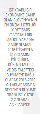İstikrarlı bir ekonomiye sahip olan ülkenin en önemli özelliği iyi yetişmiş ve verimli bir iş gücü yapısına sahip olması. 2016 itibarıyla iş ortamını iyileştiren düzenlemeler ve dış talepteki büyümeye bağlı olarak ekonominin hızlanması beklenirken, 2016-2018 yılları arasında beklenen büyüme oranı ise yüzde 2,2 olarak açıklanıyor. Ancak Sloven ekonomisinin Euro Bölgesi’ndeki gelişmelere açık ve kırılgan yapısını sürdürüyor olması, orta uzun vadeli beklentilerin revizyona açık olmasını da kolaylaştırıyor. Ücret seviyesini verimlilik artışlarıyla eş düzeyde tutmaya dayalı bir makroekonomik yaklaşım sergileyen Slovenya’da bu durum, ülke ekonomisinin gelişimindeki anahtar faktörlerden biri olarak karşımıza çıkıyor. Bu anlamda Sloven firmalar orta ve yüksek düzeyde teknoloji gerektiren sanayi dallarına yönelirken, 2008 krizinde otomotiv firmalarının ülkede üretimi durdurmuş olması imalat sanayisinin GSYİH içindeki payının azalmasındaki temel sebep olarak gösteriliyor.
