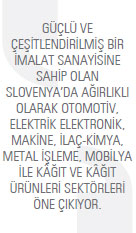 Güçlü ve çeşitlendirilmiş bir imalat sanayisine sahip olan Slovenya’da ağırlıklı olarak otomotiv, elektrik elektronik, makine, ilaçkimya, metal işleme, mobilya ile kâğıt ve kâğıt ürünleri sektörleri öne çıkarken, Sloven ekonomisinin yüzde 3’üne yakın bir bölümünü üstlenen tarım sektörü ise yüksek verimliliğine rağmen modernleştirme çalışmalarına açık pozisyonunu koruyor.