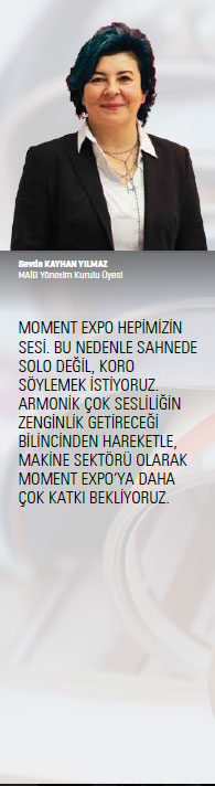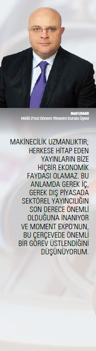 Biliyoruz ki makine imalatı stratejik bir sektör. İhracat kilo değerini artırmadığımız zaman orta gelir tuzağından kurtulamayacağımız artık aşikâr. İleri teknoloji ve katma değerli ürünler yapabilirsek kişi başına düşen milli gelirimizi istenilen yerlere daha rahat getirebiliriz. Makine imalatında katma değeri yüksek ürünler yaparsak, hem ithalatın önüne geçebilir hem de ihracatı artırarak ülkemizin geleceğinde önemeli bir rol üstlenebiliriz. Ağaç yaşken eğilir misali, yeni nesillere üretimi sevdirilmeliyiz. Kendi makinemize olan güveni yükseltmeliyiz. Bunun için de elbette sektörümüzün nitelikli tanıtımına ihtiyacımız var. Buradan, özellikle Makine İhracatçıları Birliği ve Türkiye’nin Makinecileri’ndeki arkadaşlarıma, tüm ihtisas dernek yöneticilerine yaptıkları faaliyetler için teşekkürlerimi iletmeliyim. Daha önce de söyledim, hep söylüyorum: Makinecilik uzmanlıktır; herkese hitap eden yayınların bize hiçbir ekonomik faydası olamaz. Bu anlamda gerek iç, gerek dış piyasada sektörel yayıncılığın son derece önemli olduğuna inanıyor ve Moment Expo’nun, bu çerçevede önemli bir görev üstlendiğini düşünüyorum. Kendi adıma, yeni sayılarını ilgiyle takip ediyor, meslektaşlarım ve sektörümüz hakkında güncel bilgilere sahip oluyorum. Kişisel olarak, elbette Moment Expo’nun içeriklerinin zenginleştirilmesini isterim. Örneğin sektördeki birçok iş insanı yeni siparişler konusunda endişe duyuyor. Dolayısıyla Türk makinesi için yeni pazarlar, bu pazarların standartları hakkında yayımlanacak bilgilerin faydalı olacağına inanıyorum.