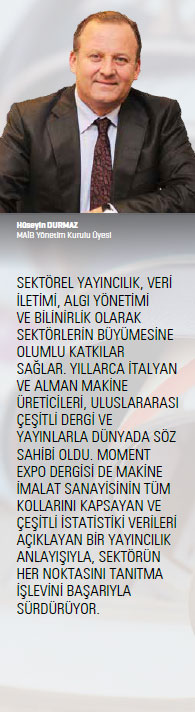 Diğer yandan, sektörün tanıtımı için fuarlar başta olmak üzere sektörel yayıncılık çok önem arz ediyor. Yıllarca İtalyan ve Alman makine üreticileri uluslararası çeşitli dergi ve yayınlarla dünyada söz sahibi oldu. Bilindiği üzere, sektörel yayıncılık, veri iletimi, algı yönetimi ve bilinirlik olarak sektörün büyümesine olumlu katkılar sağlıyor. Moment Expo da makine imalat sanayisinin tüm kollarını kapsayan ve çeşitli istatistiki verileri açıklayan bir yayıncılık anlayışıyla, sektörün her noktasını tanıtma işlevini başarıyla sürdürüyor; dünyada ve ülkemizdeki ekonomik ve siyasi konjonktüre göre yayın stratejisini değiştirerek sektörde her zaman “işler rayında” mesajı veriyor. Bu günlerde verilen “Türkiye’de işler yolunda” mesajı, hepimiz için çok anlamlı değil mi? Makine imalat sanayicilerimiz ülkemize güvensinler ve çok çalışmaya devam etsinler. Hedeflerimiz var; dünyanın en aranan, en kaliteli, en teknolojik makinelerini yapmak için çalışmaya, bayrağımızı dünyanın her yerine dikmeye devam edelim. Nitelikli teknik insan kaynağı bakımından birçok ülkeden ilerideyiz. Bilgi birikimimizle, en son teknoloji ve akıllı makineleri Endüstri 4.0 ile bütünleştirerek dünyayı sallamaya devam edeceğiz.
