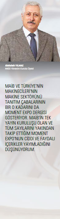 Sektörümüzün tanıtımı için özellikle yurt dışı sektör yayınlarında da bulunmaya gayret ediyoruz. Sektör yayınları direkt olarak hedef kitlemize hitap ettiğinden güzel de sonuçlar elde ediyoruz. Reklam bütçelerinin direkt sektör yayınlarına verilmesi, bence en doğru yatırımlardan biridir. Diğer yandan, MAİB ve Türkiye’nin Makinecileri’nin makine sektörünü tanıtım çabalarının bir o kadarını da Moment Expo gösteriyor. MAİB’in tek yayın kuruluşu olan ve tüm sayılarını yakından takip ettiğim Moment Expo’nun ciddi ve faydalı içerikler yayımladığını düşünüyorum. Bu vesileyle de Moment Expo’nun nice 100’üncü sayılara ulaşmasını ve başarılarının devamını temenni ederim. MAİB Yönetim Kurulu Üyesi olarak; sektörün tanıtımı için tüm faaliyetlerde bu zamana kadar hiçbir destekten kaçınmadık. Büyük başarılara ulaşma yolunda üzerimize düşen tüm görevleri üstlenmeye hazırız. Bu çerçevede, tüm sektör temsilcileri ve sanayimizdeki makine kullanıcılarının, tercihlerini yerli üretimlerden kullanması gerekliliğini bir kez daha anımsatmak isterim.