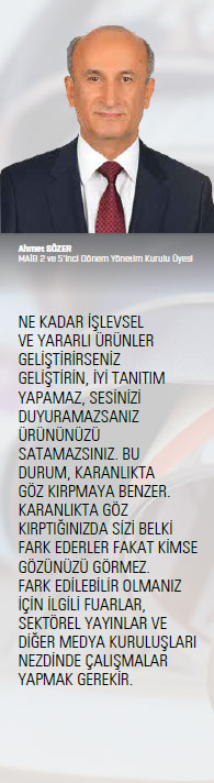 Kendine has ve segmentleri itibariyle çeşitlenen yöntemleri var bu sektörün tanıtımda. Evlerde kullanılan makinelerde genel reklamlarla başarıya ulaşılırken, sanayide ve hizmette kullanılan makinelerde, yani yatırım mallarında sınırlı bir kitleye hitap etmek durumunda olunur. Bunların ticareti ve pazarlaması da ayrı bir uzmanlık konusudur. Sektörel yayınlar bu makineler için doğru mecralardır. Biz, tepe örgütlerimizde, çoklukla sektörün genel imajı üzerinde çalışıyoruz. Türkiye’de sektörün geldiği yeri anlatmaya, bu başarıda en büyük etken olan ve “Makineci” dediğimiz imalatçımızın hasletlerini öne çıkarmaya gayret ediyoruz. “Türkiye’nin Makinecileri” kavramı da bu saikle türetilmiştir; küresel bir rekabet içinde ülkemizi öne çıkarmaya çalışan bir takım; milli bir vasfı var. Öte yandan, 22 kadar segmentimizin tanıtımını çok çeşitli mecralarda, az evvel dile getirdiğim incelikler doğrultusunda farklı biçimlerde yapmak vazifemiz vardır. Birlik ve federasyonlar sektörün geneli üzerine, dernekler ürünler üzerine çalışırlar.