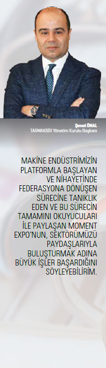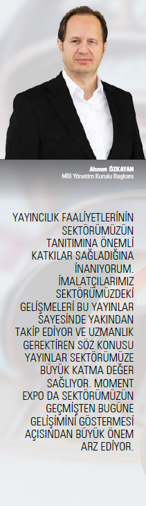 Bu bağlamda, makine sektörünün resmi yayın organı olan Moment Expo’yu da çok önemsiyoruz. Sektörel yayıncılığın önemi büyük. Dolayısıyla 100’üncü sayıya ulaşmak apayrı bir başarıdır. Makine sektöründe önemli ufuklar açan ve makine sektöründeki birimlerin birbirlerini tanımaları açısından da Moment Expo’nun müthiş bir misyon üstlendiğini görüyorum. Bu misyon bugüne kadar başarıyla getirildi ve Moment Expo, bizim tabirimizle, makine sektörü için vazgeçilmez bir sektörel yayın ikonu oldu.
