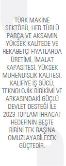Makine sektörü olarak, 2023 hedeflerimiz kapsamında toplam 75 milyar dolar ihracat gerçekleştirerek dünyada ilk beş makine ihracatçısı arasına girmeyi amaçlıyoruz. Yine, Türkiye’nin toplam ihracatı içindekini payını, makine sektöründe söz sahibi olan ülkelerde olduğu gibi yüzde 20’ye çıkarmayı bir diğer hedef olarak belirlemiş durumdayız. Hali hazırda küresel pazarların devleriyle rekabet etme kapasitesine haiz Türk makine sektörünün potansiyelini ortaya çıkarmak için neler yapmamız gerektiği üzerinde yoğun çalışmalar sürdürüyoruz.