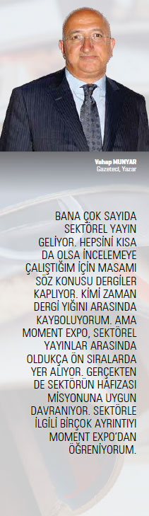 Sektör için bir arşiv niteliği taşıyan Moment Expo’nun başka bir işlevi de yerli üreticinin birbirini tanıyarak işbirliğini artıracak ortam oluşmasını sağlaması. Ancak böyle, ölçek ekonomisini yakalayarak, rekabetçi hale dönüşebiliriz. İlginçtir, son yıllarda yurt dışı fuarlarda, diğer ülkeler kadar Türk firmaları da müşteri olarak ziyaret etmeye başladı. Dergimiz de, birbirimizi tanımamız için iyi bir araç.