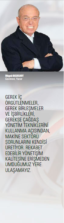 Makine üreticilerimizin üç alana dikkat etmeleri gerekiyor: Birincisi sektörle ilgili “dinamik envanter” konusunu aşmadan, aynı sözleri tekrarlayarak enerji israf etmenin önüne geçemeyiz. İkincisi, bir “Makine Üretimi Enstitümüz” olmalı ki entelektüel gelişmeleri üreticilerle paylaşsın; bilincin temeli olan dünyadaki gelişmeleri sezme, anlama, açıklama konusunda doğru konumlama yapabilelim. Üçüncüsü de “rasyonel otorite” olabilecek bir “mesleki yayınımız” olsun. Yazdığım her sözcük tartışmaya açıktır. Gelin açık ortamlarda tartışalım; eksiklerimizi tamamlayalım, yanlışlarımızı düzeltelim ve entegre olan bir ilerleme yaratalım ki dünyada saygın bir konumumuz olsun.