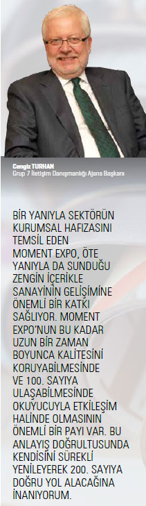 Moment Expo, bir yanıyla kurumsal hafızayı temsil ediyor. Öte yanıyla da sunduğu zengin içerikle sanayinin gelişimine önemli bir katkı sağlıyor. Derginin 100 sayılık geçmişini ele aldığımızda, buradaki içeriğin makine sektörüyle sınırlı kalmadığını, Türk sanayisinin tamamına hitap ettiğini görüyoruz. Başta yurt dışıyla iş yapan ihracatçılarımız olmak üzere, Türkiye sanayisinin gelişimiyle ilgilenen ve ekonomimizin rekabetçi bir karakter kazanabilmesi üzerine kafa yoran herkesin yararlanabileceği kıymetli bir kaynak olduğunu düşünüyorum. Moment Expo’nun bu kadar uzun bir zaman boyunca kalitesini koruyabilmesinde ve 100. sayıya ulaşabilmesinde okuyucuyla etkileşim halinde olmasının önemli bir payı var. Bu anlayış doğrultusunda kendisini sürekli yenileyerek 200. sayıya doğru yol alacağına inanıyorum.