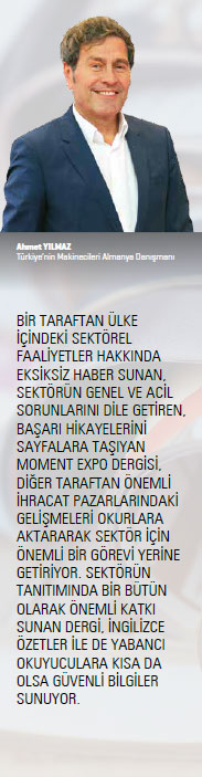 Künyesinde adımın bulunmasından büyük gurur duyduğum, sekiz yıldır her ay aralıksız geniş bir içerikle özenle hazırlanan Moment Expo’nun sektörde tüm paydaşların sesi olduğunu düşünüyorum. Yurt içinde çok sayıda düzenli okuru olan dergi, elektronik olarak da çok geniş bir kitle tarafından takip ediliyor. İngilizce bölümlerinin olması okur kitlesini yurt dışına da taşıyor. Bu anlamda Moment Expo’yu sektörün tanıtımı için çok önemli bir yayın olarak görüyorum. Makine sektöründeki gelişmeler takip edilmek isteniyorsa Makine İhracatçıları Birliği’nin faaliyetlerinin, duyurularının ve aylık yayını Moment Expo’nun mutlaka okunması gerekiyor. Çıkarılan ek kitaplar da tıpkı Moment Expo gibi arşiv niteliğinde.