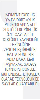 Moment Expo mevcutta içerik olarak oldukça geniş bir zenginliğe sahip. Daha fazla içeriğin artırılması bu formatta ve fonksiyondaki bir dergi için fazla olabilir. Ama başka yöntemlerle içerik fazlalaştırılabilir ve fazlalaştırılmak zorundadır. Örneğin, Moment Expo üç ya da dört aylık periyodlarda alt sektörlere yönelik özel sayılar ile sektörel yayıncılığı derinliğine zenginleştirebilir. Hatta bunu bir adım daha ileri taşıyarak, sadece teknik personele, mühendislere yönelik olarak teknolojik ek sayılar çıkartabilir. Ülkemizde en fazla eksikliği hissedilen alan teknik alanda makale azlığı ve görüşlerin beyan edileceği platform yoksunluğu. Belki üniversitelerin ilgili bölümleri ile ortaklaşarak bu açığı kapatmaya yönelik özel sayılar yayınlanabilir. Moment Expo’yu sektörle buluşturmaya önayak olan ve hazırlayan tüm arkadaşlara teşekkürlerimi sunar ve başarıların devamını dilerim.