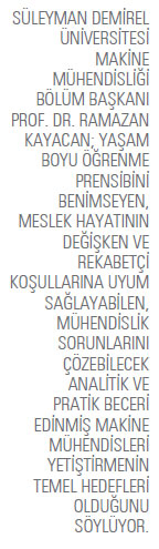 Bölümün halen mühendislik fakültesi bünyesinde eğitim-öğretimine devam ettiğini söyleyen Süleyman Demirel Üniversitesi Makine Mühendisliği Bölüm Başkanı Prof. Dr. Ramazan Kayacan, “Bölümümüzde 1984- 1985 eğitim-öğretim yılından itibaren yüksek lisans ve 1993-1994 eğitim-öğretim yılından itibaren de doktora programları sürdürülüyor. 2011-2012 eğitim-öğretim yılında ise bölümümüzün bir alt programı olarak otomotiv mühendisliği lisans programı eğitim-öğretime başladı. Halihazırda; mekanik, makine teorisi ve dinamiği, konstrüksiyon ve imalat, enerji, termodinamik ve otomotiv olmak üzere altı anabilim dalı bünyesinde 10 profesör, beş doçent, sekiz doktor öğretim üyesi ve ikisi doktor olmak üzere 13 araştırma görevlisinden oluşan 36 öğretim elemanı tam zamanlı olarak görev yapıyor. Ayrıca bölümümüzde üç teknik personel ve üç bölüm sekreteri bulunuyor” diyor.