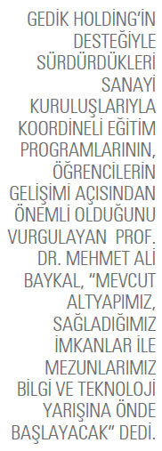 Mühendislik etiğini özümsemiş, global olarak sanayi, üretim ve akademik dünya arasında koordinasyonu sağlayabilecek; çağdaş, araştırma yeteneği gelişmiş, projelerde liderlik yapabilecek özgüvene sahip, dinamik mühendisler yetiştirmenin temel hedefleri olduğunu belirten Gedik Üniversitesi Makine Mühendisliği Bölüm Başkanı Prof. Dr. Mehmet Ali Baykal, bölümün kuruluşundan itibaren hem altyapı olanakları, hem de akademik kadro açısından hızlı bir gelişim gösterdiğini söyledi. Gedik Üniversitesi Makine Mühendisliği Bölümünün farklı sanayi projeleri üzerinde çalışmayı sürdürdüğünü aktaran Prof. Dr. Mehmet Ali Baykal, bölümün yapısı, kuruluş amaçları ve hedefleriyle ilgili bilgi verdi.