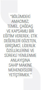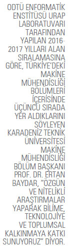 Bölümlerinde birinci ve ikinci öğretim olmak üzere iki lisans programının paralel olarak sürdürüldüğünü söyleyen Karadeniz Teknik Üniversitesi Makine Mühendisliği Bölüm Başkanı Prof. Dr. Ertan Baydar, 2005 yılında açılan İngilizce hazırlık sınıfıyla birlikte birinci öğretim lisans programında derslerin yüzde 30’unun İngilizce olarak verildiğini belirtiyor. Bölüm bünyesinde termodinamik, malzeme bilimleri, konstrüksiyon ve imalat, makine teorisi ve dinamiği, mekanik, otomotiv ve enerji anabilim dallarının bulunduğunu da sözlerine ekleyen Baydar, “Eğitimde belirlediğimiz temel hedef lisans ve lisansüstü seviyede çağdaş ve kapsamlı bir eğitim vererek; etik değerleri gözeten, girişimci, liderlik özelliklerine ve sürekli yenilenme anlayışına sahip makine mühendisleri yetiştirmek. Özel sektör ve kamu kurumlarıyla işbirliği içerisinde özgün ve nitelikli araştırmalar yaparak bilime, teknolojiye ve toplumsal kalkınmaya katkı sağlamak” diyor.